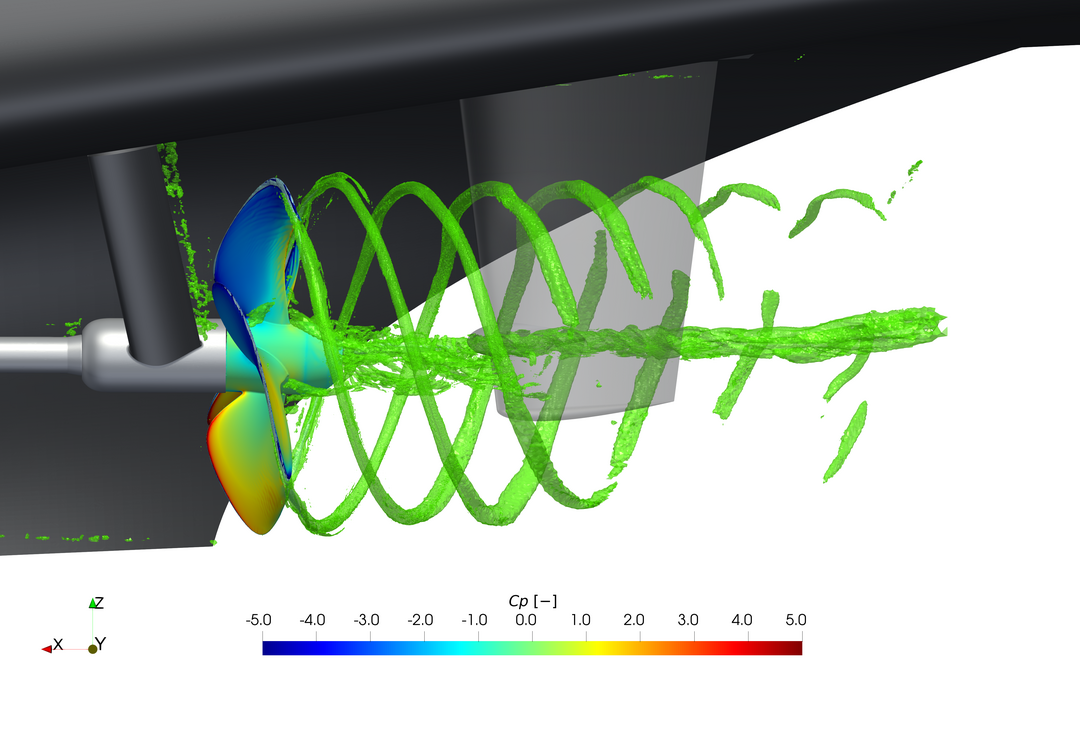 In order to minimize URN, SCHOTTEL uses CFD simulations during the design phase of propulsion systems. Computational Fluid Dynamics (CFD) has been an integral part of hydrodynamic design for years and is used to simulate the risk of cavitation and noise development, among other things. The insights gained are used to optimize the cavitation behaviour of the propeller. In addition, SCHOTTEL offers the support of model tests, in which reliable noise predictions are made and scaled up to the full-size version of the selected propulsion solution.