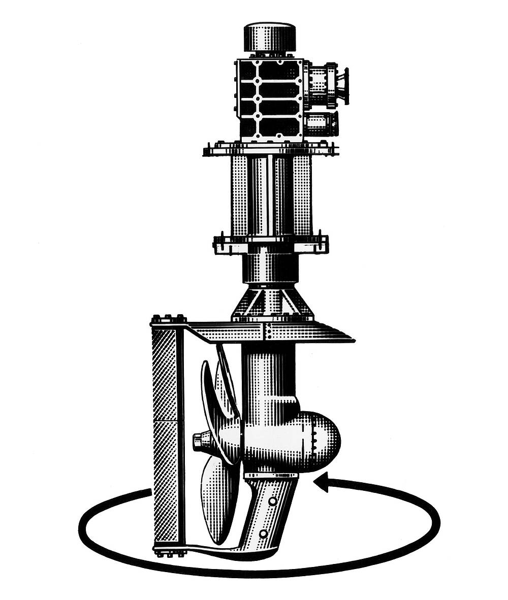 With the SRP, a ship has the full power of its propulsion engine available for manoeuvring for the first time without the need for a separate rudder blade. The police boats (see 1952) turn at full speed in just 1.5 boat lengths and turn almost on the spot at slow speed. A 180° turn of the propeller is sufficient to change from “full ahead” to “full astern”.
